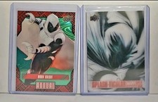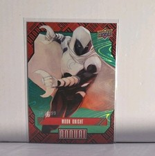 *Both cards display NM or better & are sold together* The 2021-22 Marvel Annual Moon Knight Green Wave Parallel 312/499 & Splash-Ticular trading cards are a collectible set featuring the character Moon Knight from the Marvel franchise. Manufactured by Upper Deck, these original cards are made of card stock and come in the standard size. The set includes 2 cards with lenticular and splash-ticular features, perfect for fans of superhero and action genres in TV and movies. These cards are a must-have for collectors looking to add unique and limited edition items to their collection.