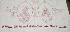 This vintage Catholic prayer tablecloth features Mary and Jesus, making it a beautiful addition to any religious space. The fabric is durable and adds a touch of elegance to the table. It is perfect for use in a home or church setting. The tablecloth is pre-owned, but its condition is still excellent with some stains see pictures for details
