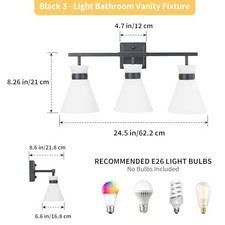 Matte Black Bathroom Light Fixtures, 3-Light Modern Bathroom Vanity Lights Over Mirror, Wall Sconces Lamp with Milky White Frosted Glass Shades, E26 Base (Bulbs Not Included). ETL-Certified Ceramic E26 base: The vanity light fixtures is compatible with any E26 base bulbs max 60W, including incandescent, CFL, halogen, and LED bulbs.