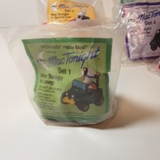 The product is a lot of 6 McDonald's Happy Meal toys featuring a character from the Mac Tonight campaign, specifically the Moon Man design. He is featured in a jeep, a sports car, on a surf ski, a scooter, a skateboard and flying an airplane. These toys were from 1988 and are sealed in their original packaging. This collectible set allows fans of McDonald's memorabilia and vintage toys to own a piece of fast food history. It represents a nostalgic piece of the Mac Tonight character family and offers a unique addition to any toy collection.