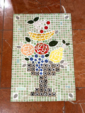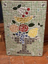 DEPICTS ABSTRACT FRUIT CHERRY BANANA APPLE PEAR ORANGE IN COMPOTE BOWL. MOSAIC TILE. MID CENTURY MODERN DATED 1963 ON BACK. WALL ART HANGING. I TRY TO KEEP PRICES VERY REASONABLE LISTED ARE OF HIGH QUALITY.