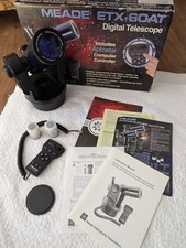 Meade ETX-60AT Telescope with Autostar Computer Controller still in original box with Meade catalog and instruction booklet. It's a high quality portable refractor telescope with a multi-coated 60mm objective lens. It includes 2 eyepieces and the other pictured items. It's excellent for viewing the moon, planets and brighter deep sky objects. The Autostar controller and go-to mount are both fully functional, and once setup will find and track the object you select. Also can be used in manual mode for celestial or terrestrial viewing. The ETX-60 can be easily connected to a camera (adapter not included) for birding and astrophotography. A great choice for "grab and go" stargazing and equally fun for beginners who are learning the sky.