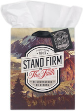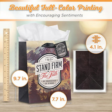 Stylish Mountainous Creation Design with Touches of Gloss: The front and back of this multicolored double-sided gift bag features an excerpt from beloved Bible verse 1 Corinthians 16:13: "Stand firm in the faith.