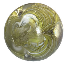 Easily removable crystal ball paperweight with internal air bubbles and cut bottom sits on holder. Nicely polished clear colorless (photo on different color surfaces to show transmittance through glass).