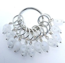 Set of 12 white glass skulls with pave crystal eyes on stitch markers with silver rings that fit up to size US 10 knitting needles. The markers reflects the light beautifully like suncatchers as you craft. Includes a ring for storage. Like jewelry for your crafting! Ships in a gift box for gift giving. Handmade in the beautiful State of Maine from premium materials and jewelry techniques.