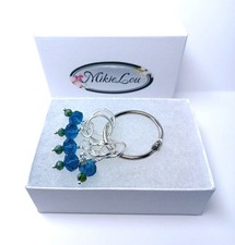 Set of 5 fire-polished faceted blue and spruce green crystal stitch markers on silver rings. The crystals reflect the light beautifully like suncatchers as you knit. Rings fit up to size 10 US knitting needles (size needle shown). Includes a ring for storage. Add some elegance and whimsy to your knitting! Handmade in the beautiful State of Maine. Ships in a jewelry box for gift giving. Knitting needle not included.