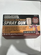 New in Box This is a Central Pneumatic Professional Adjustable Mini Detail Spray Gun. It is a professional detail gun with an adjustable fan nozzle. It can adjust from a standard circle pattern to a pinpoint fan for more accurate and efficient coverage. The spray gun has an air consumption of 3 CFM @ 50 PSI and a 1/4" air inlet. It operates at 20-50 PSI and includes a 4 oz. gravity feed cup. 20-50 PSI operating pressure. Cleaning brush and wrench not included