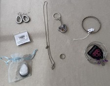 Fun mixed jewelry bundle featuring a variety of fashion pieces including beaded statement earrings, heart pendant necklace, stacking bangles, charm bracelets, a elephant style ring, novelty keychain, and additional accessories. This eclectic jewelry lot blends boho, Y2K, minimalist, and everyday fashion aesthetics making it perfect for resale, crafting, gifting, or personal styling. Includes both new with tags and preowned items with some scratches/wear as shown in photos. Brands include Paparazzi Accessories and other fashion jewelry pieces. Great assortment for jewelry lovers, resellers, or anyone who enjoys mixing trendy layered looks. Items come from a smoke free home. Please review photos for exact items and condition. SKU 1641-8-226