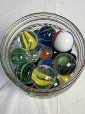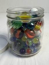 Mixed lot of assorted glass marbles in 4.5” jar. Includes various sizes including standard and larger shooter marbles. • Jar included. Type: Mixed Lot. Material: Glass. • Sold exactly as shown.