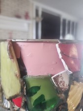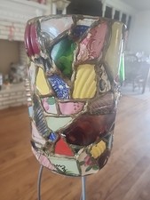 This is a crafted mosaic trashcan. The mosaic. is from many identifiable vintage broken pieces of plates from days gone by. A remarkable conversation piece for anyone who enjoys identifying pottery names. one piece of mosaic is missing from rear of trash bin. Rustic 2nd picture shows missing piece easily replaceable. price marked accordingly.