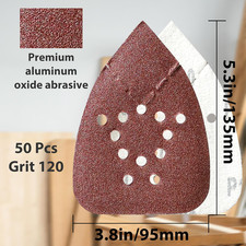 Detail Sander Sandpaper: 50 pcs 120 grit palm sander sandpaper with 12 holes 5-1/4 x 3-3/4” (13.5cm x 9.5cm), suitable for Black and Decker mouse detail sanders including BDCMS20C, BDEMS600. Hook and loop sandpaper with robust backing - good for repeated and quick changeouts; clearly marked grit on backing.