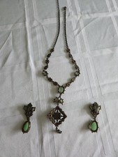 Dark metal necklace and clip earrings. Main stones are pale green with small red stones.