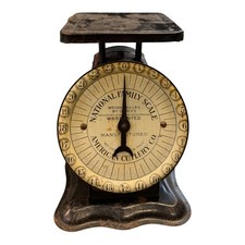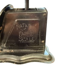 Antique National Family Scale features a 24 pound weight capacity. This primitive, industrial scale has rust on the top tray and base, but the dial is in very nice antique condition with great patina. Measure 6 1/2"x 8 3/8"x 8 1/2"T.