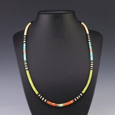Traditionally made by hand cutting, drilling, rolling, and stringing. A great strand of heishi that is finished off with sterling silver clasp. Weighs 10 grams. Fabulous colors that will look great with any outfit.