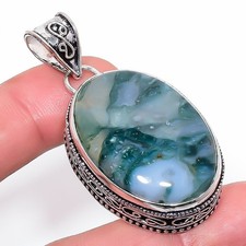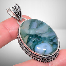 Natural Moss Agate Gemstone 925 Sterling Silver Vintage Pendant 2.1" l529