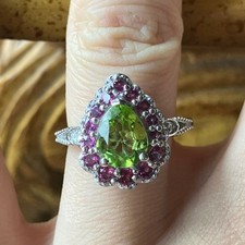 This beautiful ring features real, earth mined peridot and rhodolite garnet. It also has lab created white moissanite accents. Moissanites are a very popular and durable lab created diamond replacement. On the Mohs scale of hardness, a moissanite is around a 9.5, making them perfect for daily wear. They are additionally very sparkly. The total gemstone carat weight on the ring is 2.60, and the peridot measures 9x7mm. The ring is set in solid .925 sterling silver with a rhodium plate to prevent tarnishing. Size 7. Inventory: J5