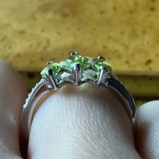 This elegant ring features all real, earth mined gemstones including peridot and white zircon. The total gemstone carat weight of the ring is 1.85. The ring is set in solid .925 sterling silver with a rhodium plate to prevent tarnishing. The ring in the photos is the actual one you will receive, so please see photos for gemstone quality and measurements. Size 6.75. What are zircons? Zircons are oftentimes confused with cubic zirconia due to the similarity in the name. However, zircons are real, earth mined gemstones from the zirconium silicate family. Zircons additionally have a high luster and are a great natural alternative gemstone. Inventory: J5