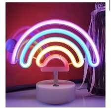 This neon LED desk lamp features a vibrant rainbow design with multiple bright colors including pink, blue, yellow, and purple. It is perfect for adding a colorful and modern touch to any room or workspace. The lamp has a sturdy white base and emits a soft, glowing light that creates a fun and cozy atmosphere.