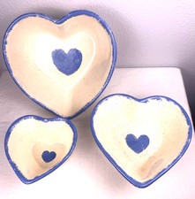 Nesting Pottery Cream Blue Heart Bowls Handmade Marked 5" 7" 9"