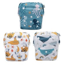 The NEW Baby Goal Nursery Reusable Swim Diapers 3 Pack is perfect for infants aged 0-8 months. These adjustable swim diapers feature a tropical design in cream, peach, apricot, yellow, and teal colors. Made of polyester material, these diapers are designed to provide incontinence protection while allowing for ease of movement during swim time. The unisex design and adjustable size make them suitable for both baby boys and girls. With a tropical style and nautical theme, these washable swim diapers are a practical and stylish choice for parents looking for reliable swimwear for their little ones.