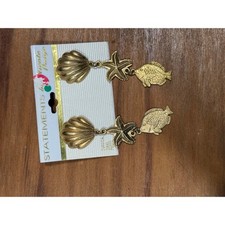 Nicole Paige Statement Earrings Gold Tone Seashell Starfish Fish Dangle vtg