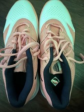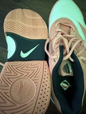 This product is a pair of Nike tennis shoes in size 6, designed specifically for women who play tennis or other sports in the summer and spring seasons. The shoes feature a lace-up closure, a low-top shoe shaft style, and a rubber outsole for maximum comfort and performance on the court. With a pink color and Nike logo accents, these athletic sneakers also have a solid pattern and are part of the Nike Tennis product line. Specifically designed for overpronation, these shoes offer a standard shoe width and a foam insole for added comfort during intense gameplay.