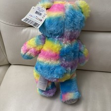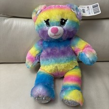 The NWT Build A Bear Rainbow Stripe Bear Bonus Club Edition is a super soft plush bear from the Build-A-Bear Workshop. This 16-inch bear features a multicolor rainbow stripe design, making it perfect for all occasions. With a black eye color with shimmer and made from plush material, this original licensed reproduction bear comes with a tie accessory included. This collectible bear is part of the Rainbow collection and was manufactured between 2010-2019 in China. Perfect for fans of the Build-A-Bear franchise, this unique bear is a must-have for any teddy bear enthusiast.