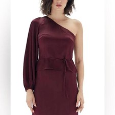 REVOLVE MINKPINK ONE SHOULDER TOP NEW WITH TAGS. SIZE: MEDIUM Size tag (will also fit S for a looser fit) COLOR: WINE (Burgundy) Poly blend Imported Hidden side zipper closure One shoulder styling with blouson sleeve and elastic cuff Removeable side waist tie detail Sheen finish Revolve Style No. MINK-WS446