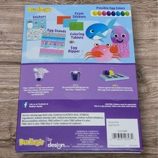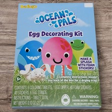 Ocean Pals Easter Egg Decorating Kit Brand: Dudley's Item: Ocean Pals Easter Egg Decorating Kit Color: Yellow, Orange, Pink, Purple, Blue, Green Pattern/Graphic: Ocean Animals Vintage: No Includes: Coloring tablets, Stickers, Foam Stickers, Egg Stands and Egg dipper. The back of the box can be used as a drying tray. Requires water, vinegar and a cup (not included). New in box.