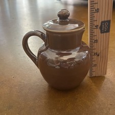The Ohio 286 Lusterware 5” Brown Pitcher is a vintage ceramic pitcher made in the USA by Ohio Lusterware. This glossy brown pitcher stands at 5 inches tall and is an original piece of art pottery. With a unique design and a hand wash only care instruction, this pitcher adds a touch of charm to any collection of jugs and pitchers.