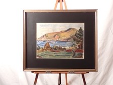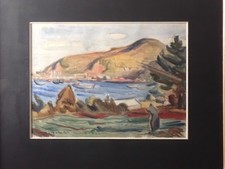 A peaceful original watercolor painting depicting a coastal harbor scene. The fluid brushwork captures the serene atmosphere of the seaside. Subject: Landscape / Seascape / Harbor. [Condition Report].