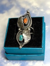 OLD PAWN Navajo signed Sterling Silver Turquoise & Coral Elongated 925 Ring 5.5