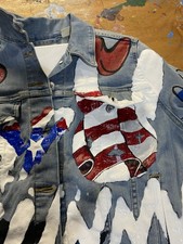 Yippy the artist hand painted a one of a kind Levi’s trucker jacket with a portrait of bad bunny on the back and bad bunny logo in the front with the Puerto Rican flag in the front.