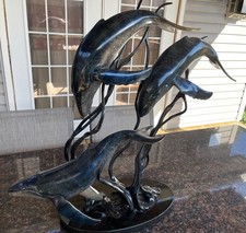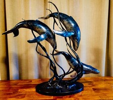 This is an original bronze triple whale sculpture standing on a solid black granite base. Approx 34 1/2 in length wise and 31 1/2 in height from base to tip. Can be created in various versions refer to photos for example of a 10 ft piece in this size.