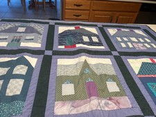 A charming neighborhood scene is depicted in this handmade, one of a kind, patchwork quilt, with each square block showcasing a distinct house using diverse colors, textures, and fabric prints, all sewn together using traditional quilting techniques.