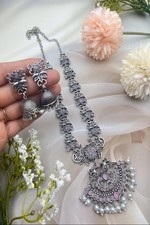 Oxidized Silver Long Necklace Set with Jhumka Earrings pink stone