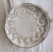 This vintage pressed glass OYSTER plate - deviled egg platter from California features a beautiful butterfly and flower design with 12 indents. Made in the 1960's, the round platter is clear glass, perfect for serving deviled eggs and relishes. The pressed glass technique adds a unique touch to this original, vintage piece, making it a charming addition to any home. EXCELLENT condition without chips, cracks, or breaks.