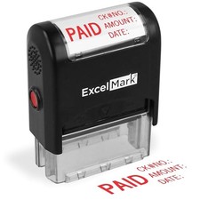 Impression area: 7/8"x 2-5/16"( A2359 stamp mount). Stamp impression: "PAID"with "CK#NO. :""AMOUNT:"and "DATE:". Ink pads are replaceable and re-inkable with self-inking ink -- prints in red ink.