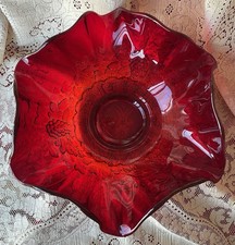 This is a beautiful red ruby bowl by LG Wright with pressed grape bunches and leaves with raised block neck and crimped edge. Measures 10.5-14” in diameter and 5” tall. No chips, cracks or cloudiness. Little to no scratches from use. Was used as table decor during Christmas. Many uses for holidays and parties. Please view all photos for wear, details and condition. Reasonable offers considered. Thanks for shopping! *will pack and ship with care*