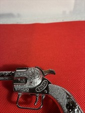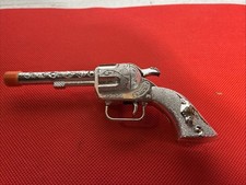 The Parris Li'l Ranger Double Holster with the brand name Smoky is a vintage toy gun designed with a cowboy and western theme. This collectible piece is perfect for fans of vintage and antique toys, particularly those interested in cowboy and western aesthetics. The double holster allows for carrying two guns, adding to the play value and authenticity of the toy. The overall design and brand name give it a unique and nostalgic appeal for collectors or enthusiasts of vintage cowboy toys. When cocked the trigger shoots the Hammer Dow.
