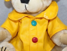 This Pickford Bears plush bear is part of the Brass Button Bears collection and features a cute beige bear with black eyes wearing a raincoat and hat. Flaws: The raincoat is cracking on the collar, a small spot on the back and a small spot on top of the hat.