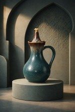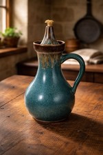 The Pigeon Forge Pottery Hand Made Signed Douglas Ferguson Oil Lamp is a unique and original piece crafted from clay with a dark cyan, turquoise, and brown drip glaze. Has lid and wick.