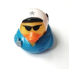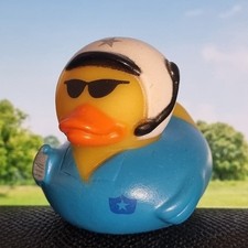 A fun yellow rubber duck dressed as a pilot, featuring a blue uniform, white flight helmet, dark sunglasses, and a small microphone headset. With its bright orange beak and cool aviator style, this themed duck is perfect for Jeep Ducking, gifting, trading, or adding a playful aviation touch to any rubber duck collection. Size: W 1.77in x L 1.97in x H 1.77in