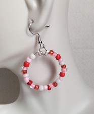 Glass Beaded Hoop Earrings Pretty Pink, Red, and White Seed Bead finished with Silver Tone Hook ear wires Handcrafted Boho Chic Retro Hippie. 3mm glass seed beads. Nickel free hook ear wires with clear backs to help keep in place.