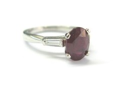 Platinum Oval Ruby & Baguette Diamond Three-Stone Ring 3.06Ct