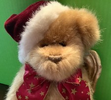 This 12" plush jointed teddy bear angel features a cute brown bear with a Santa hat and gold wings, perfect for holiday decor or as a unique gift for bear lovers. The black eyes add a charming touch to this adorable collectible bear from the Angel Bears collection. The set includes a plush hat, making it a complete and festive addition to any holiday display or collection.
