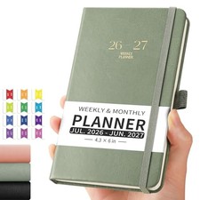 Pocket Calendar 2026-2027, Small Mini Academic Planner Weekly and Monthly, July 2026-June 2027, School Student Teacher Agenda, Leather Hardcover, 100GSM Paper, Tabs, A6 4.3"x6", Light Green. Colorful tabs enable quick flipping, and 180° lay-flat binding makes double-page writing smooth.