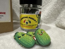 "Positive Pickle" affirmation jar gift set. It contains items designed to provide uplifting messages and motivation. The set includes a jar filled with uplifting notes. The items feature a cartoon pickle character and the brand name "Positive Pickle". The packaging indicates it is "Made with love". It is designed as a thoughtful gift to nurture a positive mindset