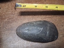 This Celt is a dark grey to black in color, partially smooth and weathered.