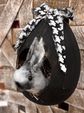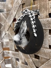 This is a papier-mâché egg shaped ornament that I have used black paint wash. The bunny is made with plush felt with bead eyes stained and painted. the bunny and moss have been glued in.  Measures 5 inches tall..  Thanks for looking… Will combine shipping